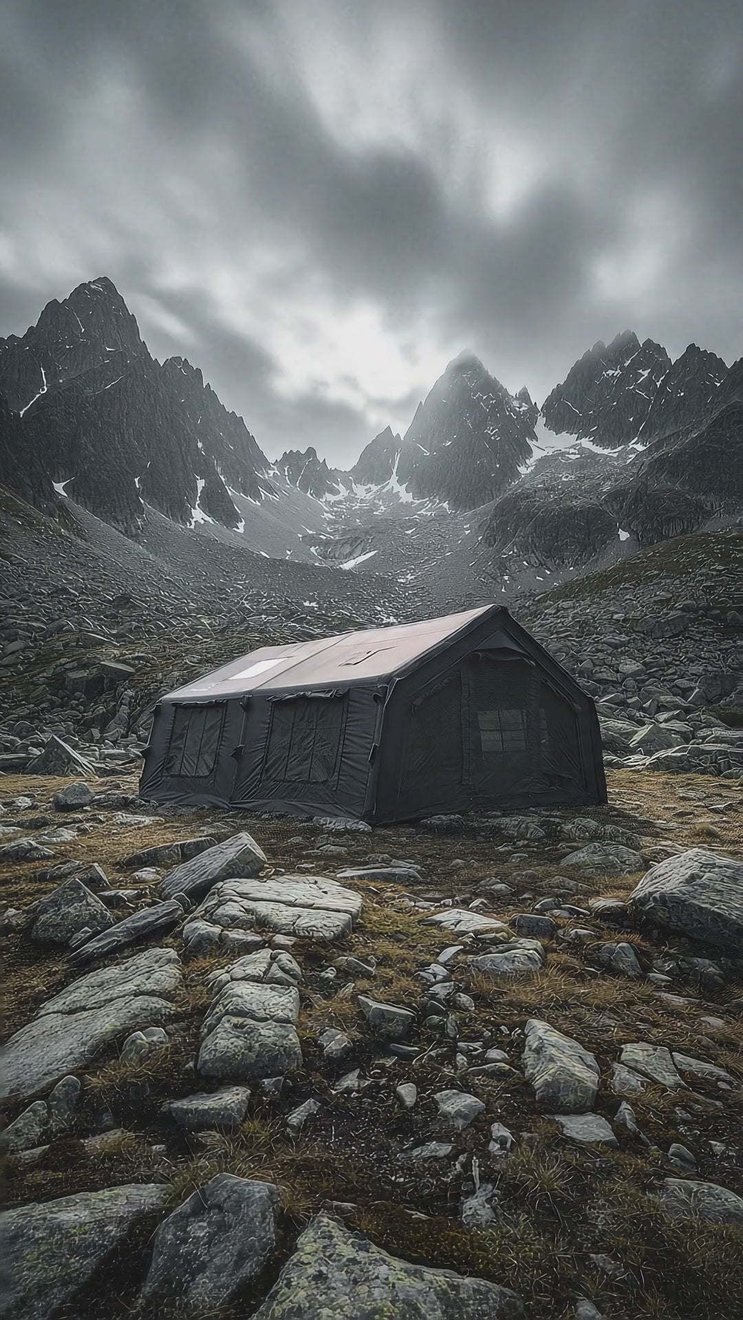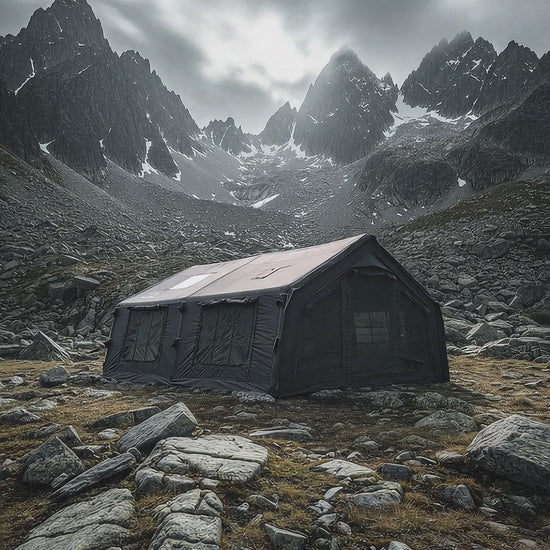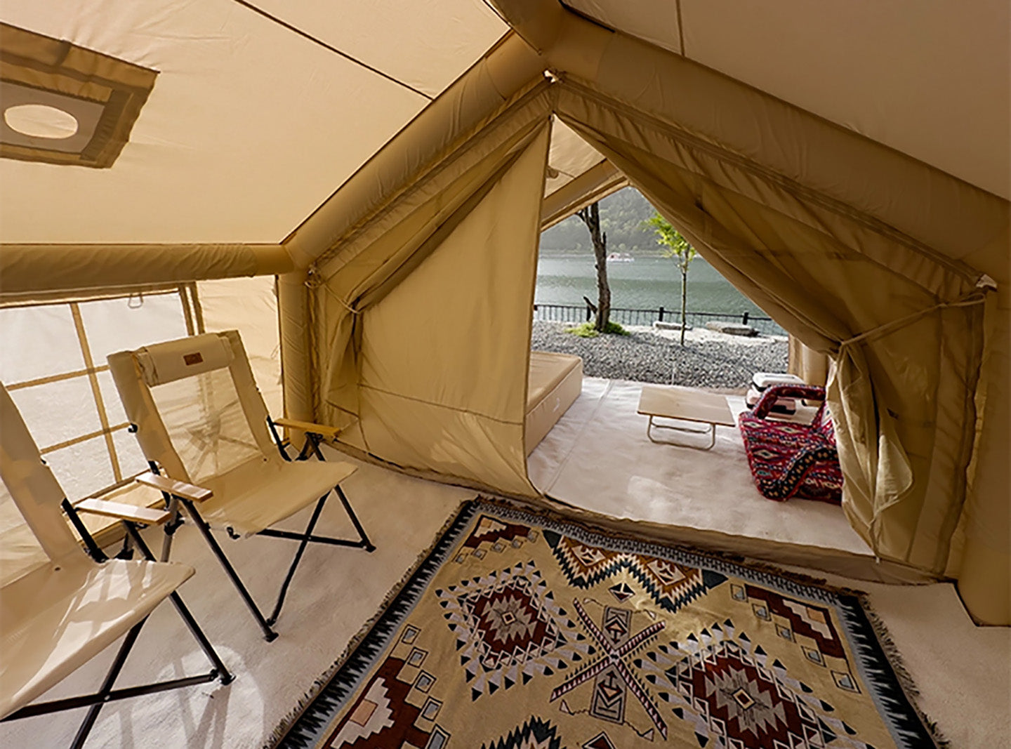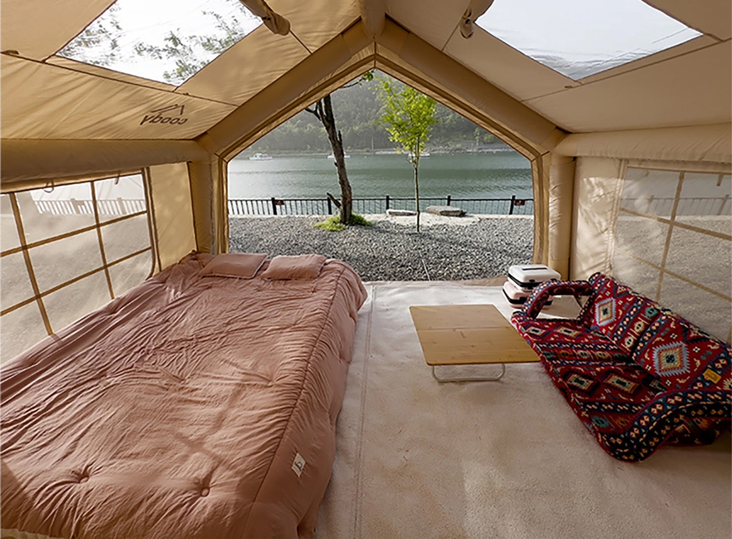 Luxury glamping in a spacious 17.2 m² inflatable tent made from breathable, waterproof technical cotton fabric. Comfortable, durable, all-season camping made easy.